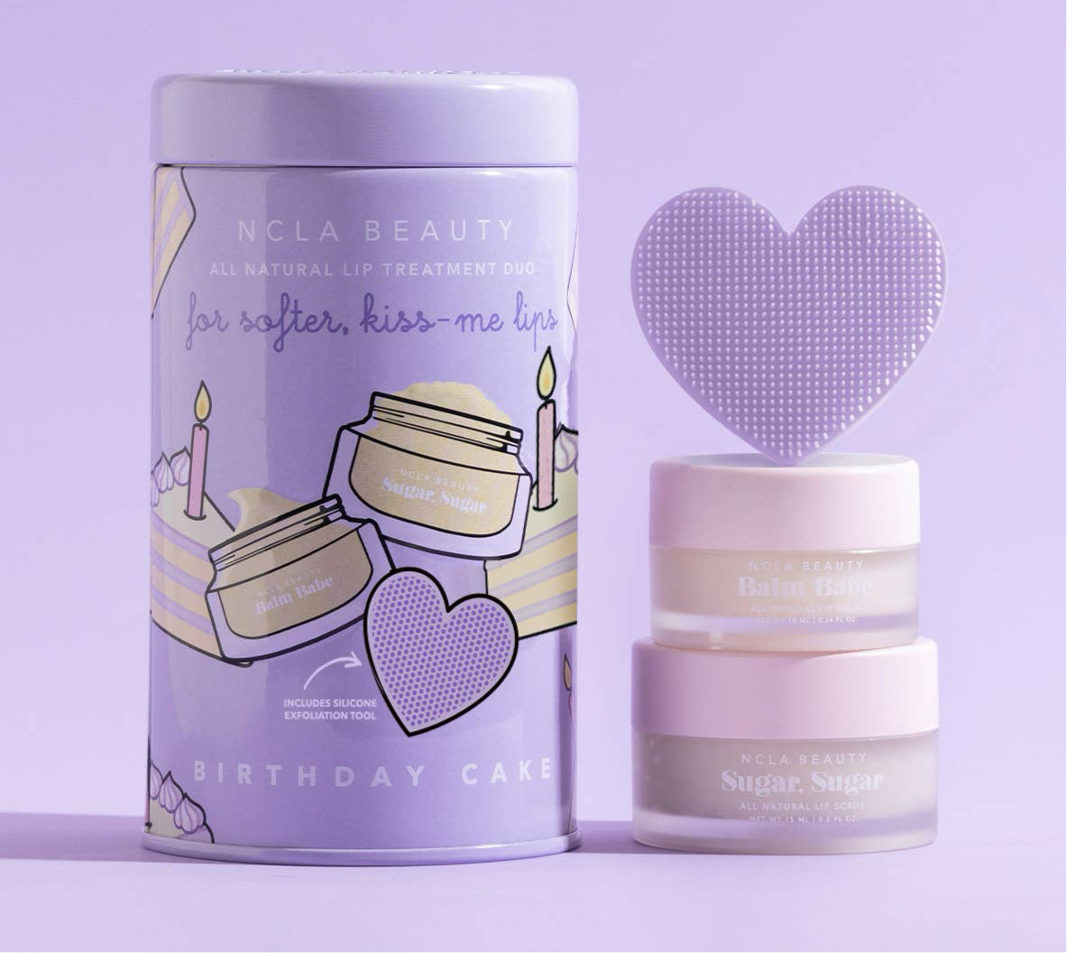 An all natural and vegan lip treatment duo in a delicious birthday cake scent. Sugar, Sugar lip scrub gently exfoliates, hydrates and brightens, while Balm Babe lip balm intensely soothes and nourishes lips. Each set comes with a silicone lip scrubber for use with Sugar Sugar lip scrub Ingredients: BALM INGREDIENTS: Butyrospermum Parkii (Shea Butter),Persea gratissima (Avocado) Butter , Hydrogenated Soybean Oil, Simmondsia Chinensis (Jojoba) Seed Oil, Cocos Nucifera (Coconut) Oil, Theobroma Cacao (Cocoa) Seed Butter, Beta Vulgaris Root Powder,Agave Tequiliana (Agave Nectar), Prunus Dulcis (Sweet Almond Oil), Ascorbyl Palmitate, Sorbic Acid (natural preservative),Tocopheryl Acetate (Vitamin E), Birthday Cake Flavor Oil SCRUB INGREDIENTS: Sucrose (White Sugar), Agave Tequiliana (Agave Nectar), Butyrospermum Parkii (Shea Butter), Daucus Carota (Vitamin E) Carrot Powder, Citrus Sinensis (Vitamin C) Orange Peel Powde
