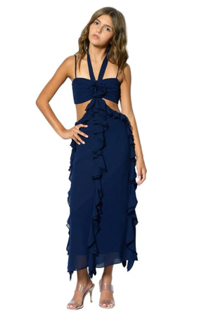 effortlessly elegant with a modern twist, this navy maxi dress by KatieJ is a standout piece for your tween girl’s spring wardrobe. Designed with a flattering halter neckline and delicate spaghetti straps, this dress features a chic cutout bodice accented by a soft rosette detail for a touch of feminine charm.