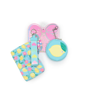 Accessorize your favorite bag with & our sweet, new 3 piece bag charm set, featuring a quilted scrunchies aqua lemon pouch, a round coin purse with a lemon applique, ;and a detachable heart printed wrist strap for extra functionality! Add it to a bag or wear it as a mini wristlet! Dimensions 4.025”H x 6.25”W x .75”D