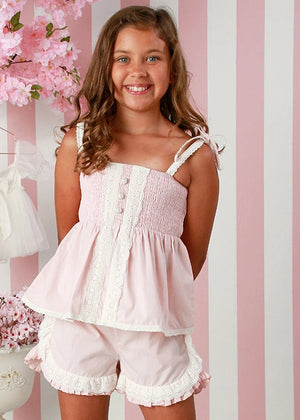 This is the sweetest short set for girls and one of my favorites for spring and summer. This 2pc short set is in the prettiest shade of pink and trimmed in sweet white eyelet. The top features smocking for a nice comfortable and flexible fit. It has eyelet straps that tie into. bow at the shoulder. Other darling details include pearl buttons and eyelet lace detailing. The shorts feature an elastic waist and sweet pink ruffles. As if it needs more cuteness they are also trimmed in sweet white eyelet.