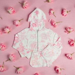The Brynn waffle shorts are sure to be her new favorite. Lightweight in a waffle texture with the most beautiful print in this new pink toile! This print is so " the moment" right now and the girls have been going crazy for it.  Its so pretty, you'll wish this came in your size. These shorts are perfect for lazy weekends, anytime lounging, camp, and sleepovers. Check out the matching hooded zip upfor the whole look.