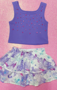 Eyelet is a big trend in girls fashion this season and we love how Mia Ny did it in this purple and blue ombre effect. This skirt features built in shorts so the girls can play worry free at school and play. We love that this skirt can pair up with so many different colors so the girls can create lots of fun looks all season long.