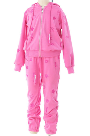 Rockwilde's signature style shines through this bubblegum pink sweat set, designed to capture attention with its playful all-over emoji print. The coordinated jacket and pants feature charm-detailed drawstrings spelling "good vibes"—a perfect reflection of the brand's eclectic aesthetic. Crafted from luxe fabrics with meticulous attention to detail, this two-piece set delivers the elevated comfort and distinctive flair Rockwilde is celebrated for worldwide. An ideal choice for girls who want to express their personality through fashion.