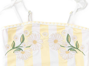 This collection features a soft butter yellow and white striped background accented with embroidered daisy florals, giving each swimsuit a timeless, vintage-inspired look with modern charm. The delicate floral embroidery adds texture and a boutique-quality finish that feels elevated and special—perfect for summer photos, beach trips, and resort vacations.