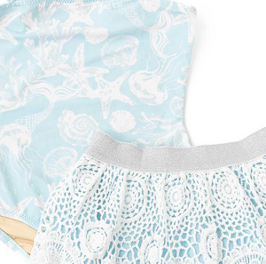 We love this blue ocean print one piece swimsuit from Shade Critters. The print features fun themes like star fish and  coral. This swim set includes the cute little swim cover0up skirt too. Shade Critters is a best selling swimwear designer in our boutique. Moms love the high quality and kids love the fun prints. Shade Critters has got you covered with our amazing selection of girls swimwear.