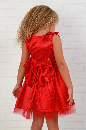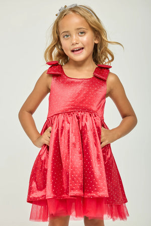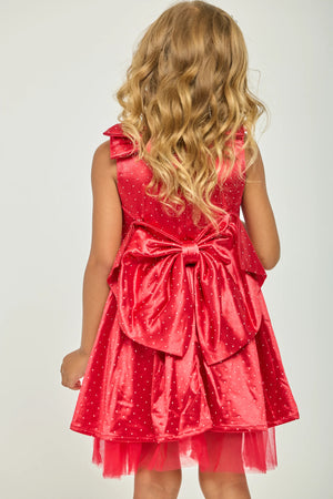 We fell in love with this girls red holiday dress from Dollfaced Kids. Do not miss the details on this one! Big bow in the back and bows at the shoulders, and shimmering rhinestones! Make every celebration sparkle with THE Holiday Dress, the ultimate statement piece for the season. Crafted in shimmering rhinestone satin, this sleeveless dress shines under every light, while the cute bow detail adds a touch of festive charm. Inside, a layer of soft tulle lining ensures comfort, so she can twirl, dance, and celebrate in style all day long.