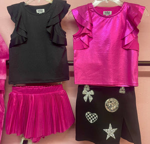 The little black tee, yes like the little black dress, every girl needs a great black fashion top. These black top features black studs sprinkled all over the front and is finished off with an amazing flutter sleeve style.  This top is perfect for the girls to pair with skirts or pants.