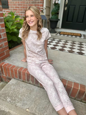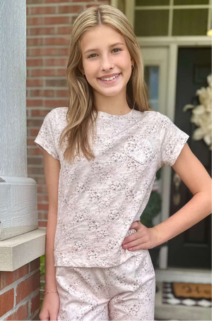 A perfect look for her floral vibes. This soft cotton tee features the most beautiful floral print with pink mini roses. This looks great with denim, skirts, and even with sweats!