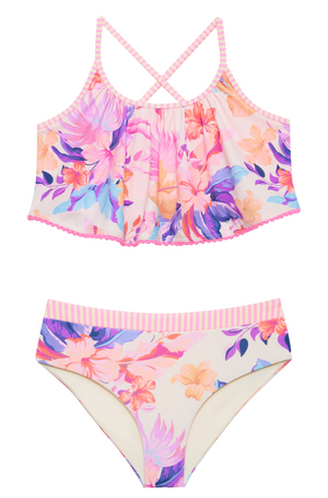 Featuring a vibrant tropical floral print with soft pink, peach, and lavender tones, this set brings a fun, elevated look to summer swim. The flowy ruffle-style top with crisscross straps adds a playful, fashion-forward touch while still providing comfortable coverage. The coordinating high-waisted bottoms offer a secure, flattering fit that tweens feel confident wearing.