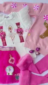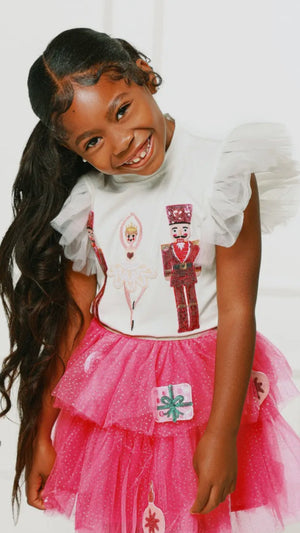Elevate her festive wardrobe with this Two-Layer holiday Tulle Skirt, adorned with playful patches of presents, ornaments, and candy canes. This enchanting skirt features a soft glittery hue and a flirty two-layer design that adds a touch of whimsy to any holiday outfit.