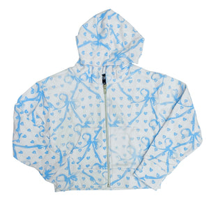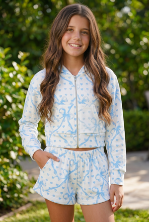 Layer her look in effortless style with this blue bow print zip-up hoodie by Flowers by Zoe (FBZ). Featuring a soft blue bow print all over, this lightweight hoodie brings together comfort and boutique-worthy design.