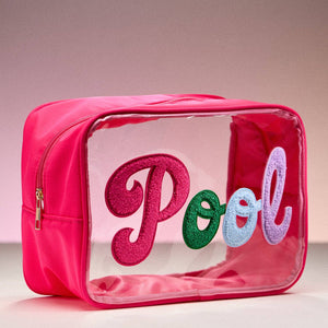 Stay organized in style with these clear travel pouches featuring a fun and bright chenille patch saying Pool Designed with a spacious interior and zip closure, they’re perfect for stashing sunscreen, swimsuits, cosmetics, or travel essentials. The see-through design makes it easy to find what you need, while the playful multicolor lettering adds a fun summer vibe. Great for vacations, beach days, or as a trendy gift. Clear PVC body with chenille word appliqué Durable zip closure with colorful trim Perfect for poolside, beach trips, or travel Fun and functional summer accessory * Size: 10.8 x 5 x 8 inches * Material: PVC with polyester fabric