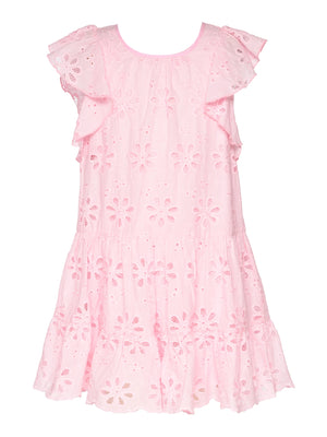 Introducing the pink tiered eyelet dress with flutter sleeves from Hannah Banana's spring/summer collection. This unique dress showcases the brand's commitment to fashion-forward, high-quality children's clothing. The flutter sleeves add a playful touch, making it a perfect addition to your child's wardrobe. Eyelet details are a big trend for 2026 in children's fashion and we love this sweet detailing. Ideal for special occasions or everyday wear, this dress reflects the stylish and unique spirit of Hannah Banana. Sizing is true