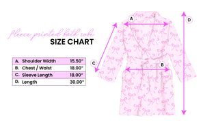 So plush and snuggly, they'll want to wear our new plush robe all day long! Detailed with a shawl collar, waist tie, and two plush bow front pockets - they'll be spa-ready at any moment! MEASUREMENTS: Chest/Waist - 18 inches Length - 30 inches Sleeve Length - 18 inches Shoulder Width - 15.50 inches