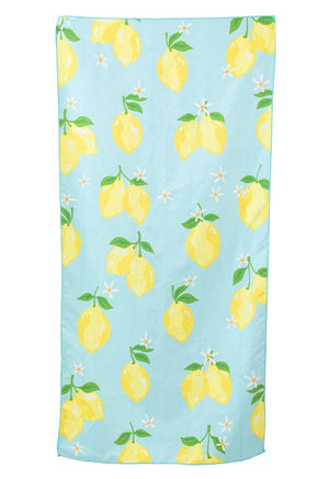 We found the cutest beach and pool towels this year and this is one of our favorites. How fun is this lemon print towel. Not only is it adorable, its high quality too. Oversized quick dry beach towel measuring 63 x 31. Highly absorbent, sand free and lightweight. These compact towels take up virtually no space in your luggage or tote bags (oh yeah, we have those too), making it perfect for packing.100% microfiber 63” x 31” compact; comes in small carry pouch wash cold or warm, tumble dry low or no heat sand-free & quick drying