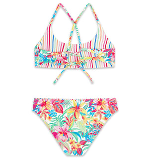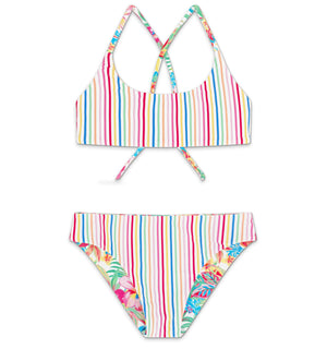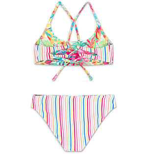 This reversible girls’ bikini from Feather 4 Arrow gives tweens the ultimate in fun, colorful, mix-and-match swim style. One side features a bold all-over tropical floral print, while the reverse side pops with bright, playful stripes—letting her create four different swimsuit looks with one set. Perfect for beach days, pool parties, and vacations, this is a must-have style for girls who love trendy, vibrant swimwear.
