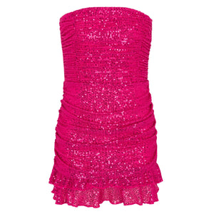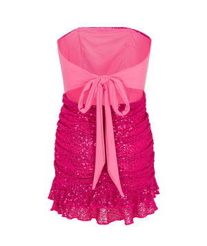 Introducing the Ophelia strapless party dress—the ultimate must-have for every stylish tween!  This trendy rose pink sequin mini dress is made from a super-stretchy, figure-hugging fabric that moves with you, so you can dance and party all night in total comfort. Covered in dazzling sequins, it catches the light from every angle—because you were born to shine!