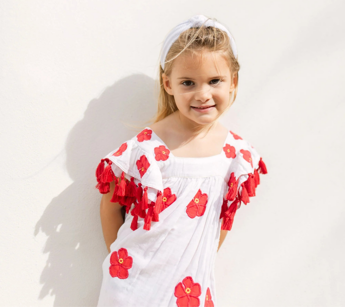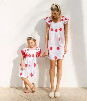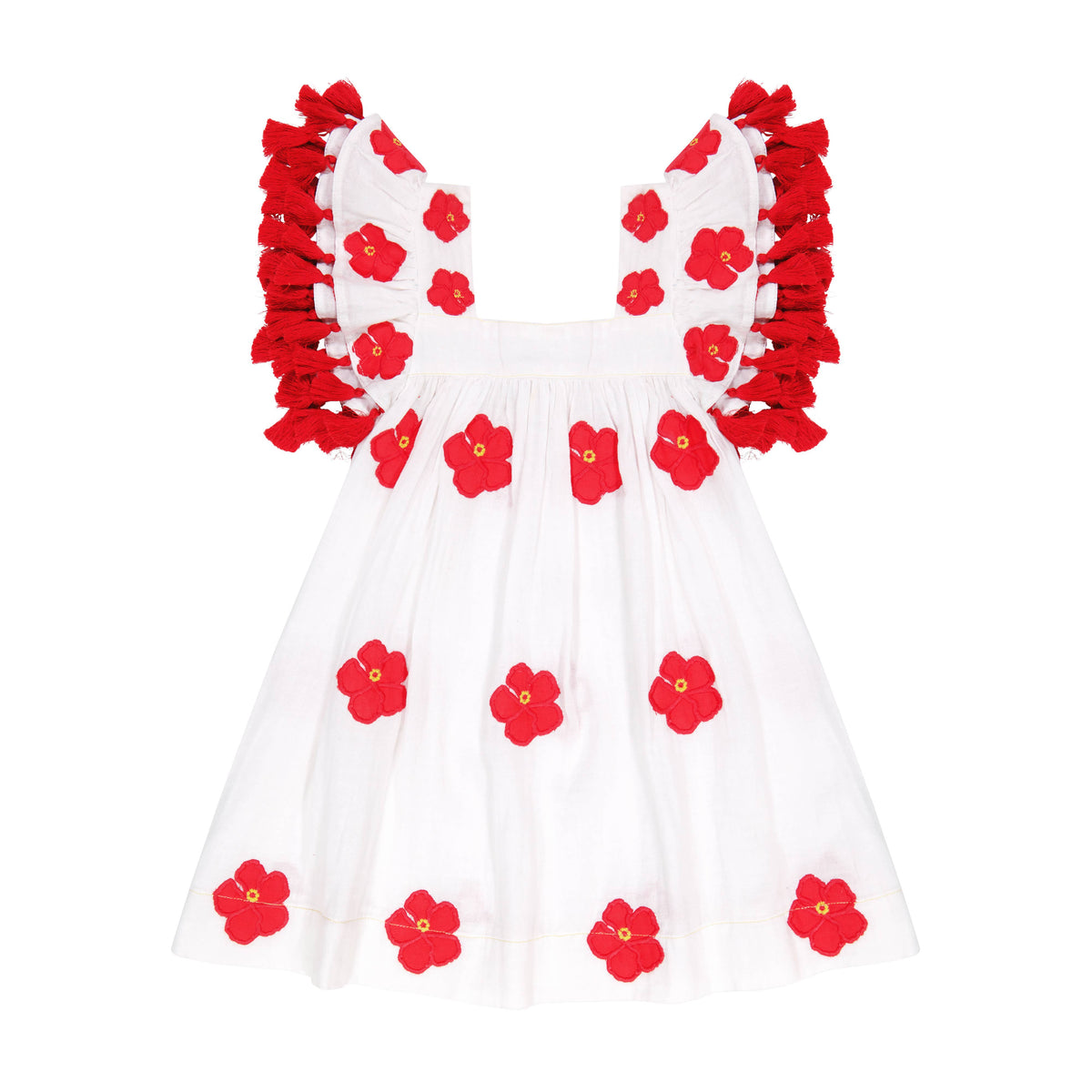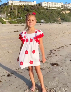 The ultimate vacay dress from Saint Barth kids . This bright hibiscus florals on a stunning crips white background evokes everything we love about island life. The Selena dress from Mer St Barth is a best selling style for girls dresses this season and gives such a playful, fun, and whimsical vibe. Of course it’s a must for vacations but don't let that limit you. Summer is always the right time to wear tropical island fashions. We all want that summer life to last forever right? This Serena Girl's Tassel Dress is crafted from soft cotton gauze and features whimsical embroidery, a double flutter sleeve, a twirly skirt, and sweet shoulder detailing. Perfect for any special occasion, this dress is sure to make your little one feel like the princess she is. 100% cotton