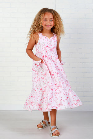 Such a sweet dress in pretty pink for spring and summer. This print is so adorable, butterflies abound will have her feeling magical everytime she wears it. Other sweet details include side pockets with bows, bow ties on the shoulder straps finish the look We love Rockwilde for its unique boutique styling. Crafted from luxe fabrics with meticulous attention to detail, this two-piece set delivers the elevated comfort and distinctive flair Rockwilde is celebrated for worldwide. An ideal choice for girls who want to express their personality through fashion.